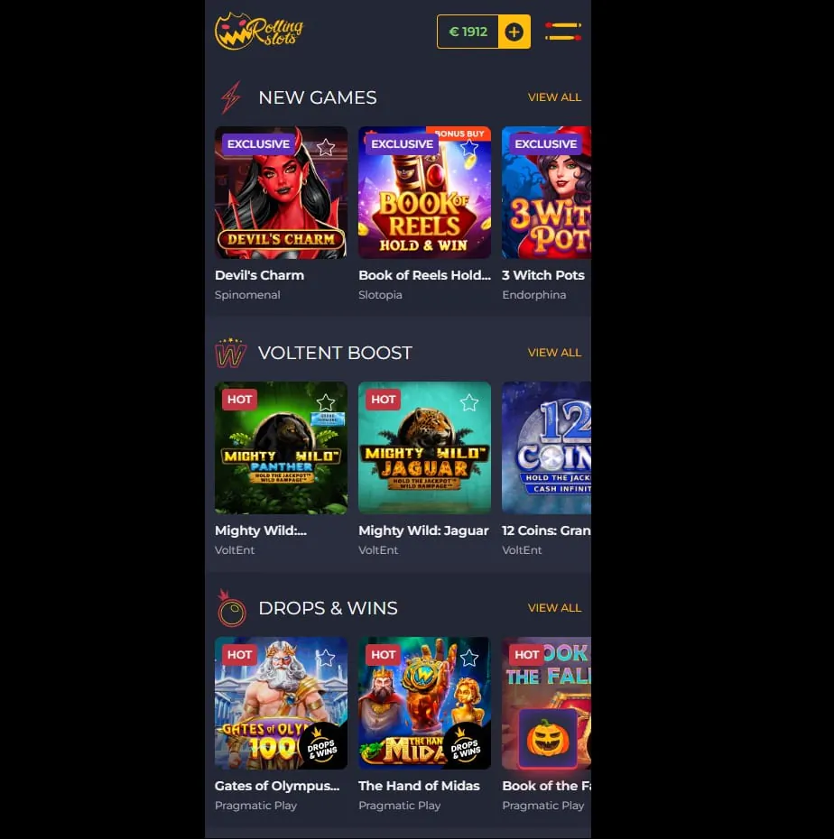 Die Benutzeroberfläche der Mobile App ist klar strukturiert: Spiele, Aktionen, Kasse und Support sind mit einem Fingertipp erreichbar. Filter helfen, Spiele nach Kategorien oder Anbietern zu sortieren. In der Kontoverwaltung könnt ihr Limits setzen, Transaktionen verfolgen und Boni prüfen. Die App merkt sich eure letzten Aktivitäten, synchronisiert Favoriten und ermöglicht den Wechsel zwischen Portrait- und Landscape-Ansicht. Sowohl auf RollingSlots Android als auch auf iPhone bleibt die Bedienung flüssig und logisch aufgebaut.